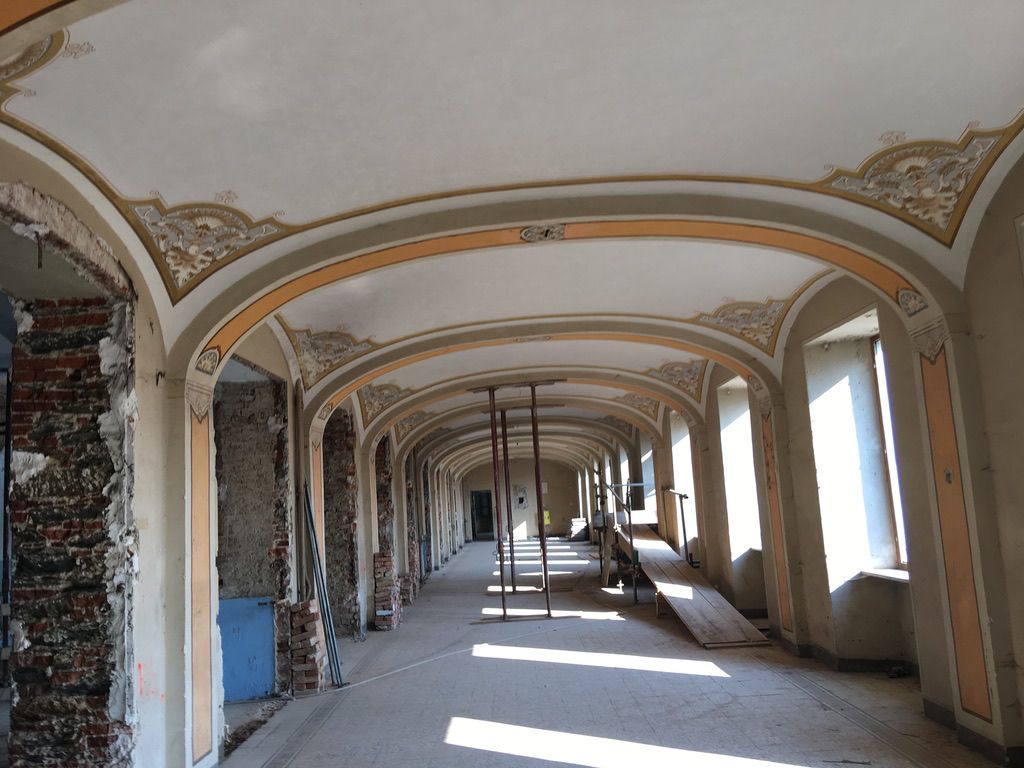 Restauro accurato di cornici, fregi e dettagli architettonici di pregio.